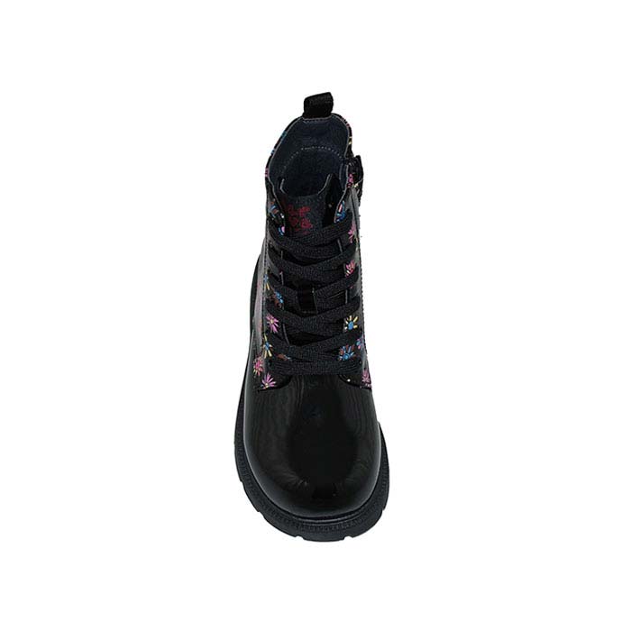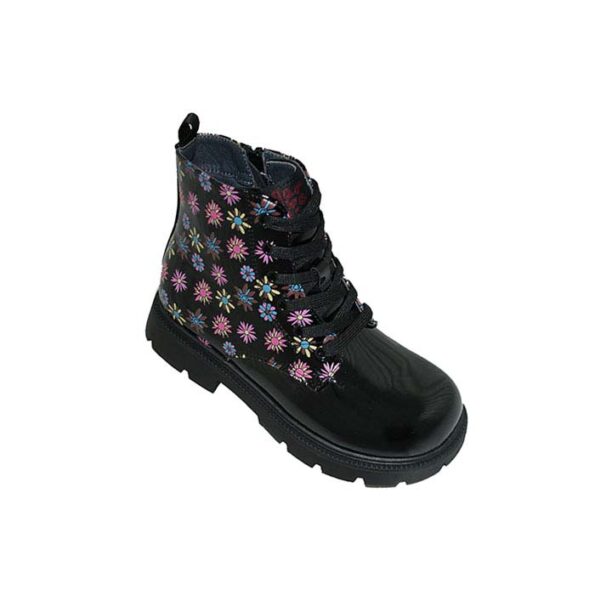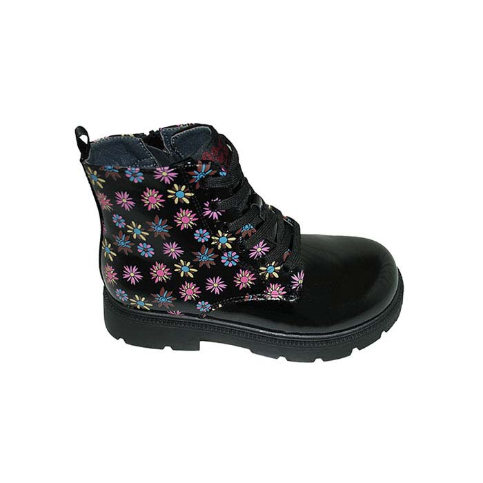 Αρβυλάκι λουστρίνι μαύρο, δερμάτινος ανατομικός πάτος, φερμουάρ στο πλάι, δέσιμο με κορδόνια, σχέδιο με λουλούδια, GARVALIN