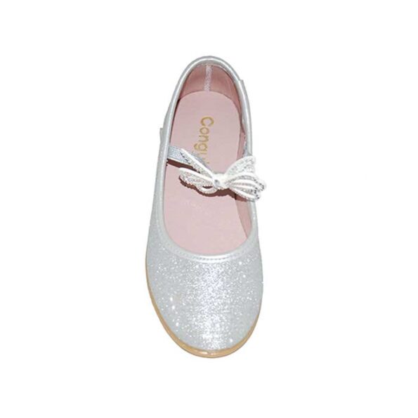Μπαρέτα ασημί, δερμάτινος ανατομικός πάτος, αυτοκόλλητο κούμπωμα, σχέδιο με φιογκάκι, CONGUITOS