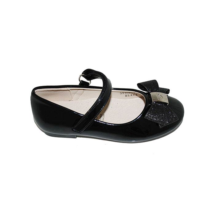 Μπαρέτα δερμάτινη μαύρη, δερμάτινος ανατομικός πάτος, αυτοκόλλητο κούμπωμα, σχέδιο με φιογκάκι και στρας, ΜΟΥΓΕΡ
