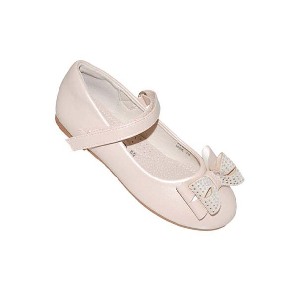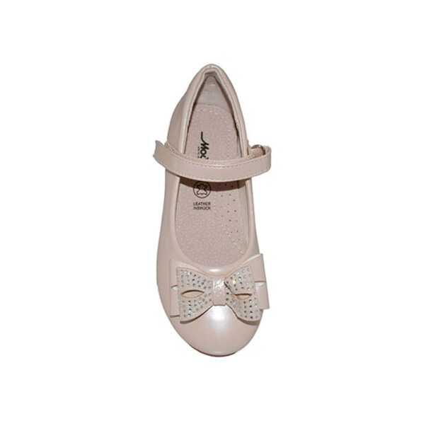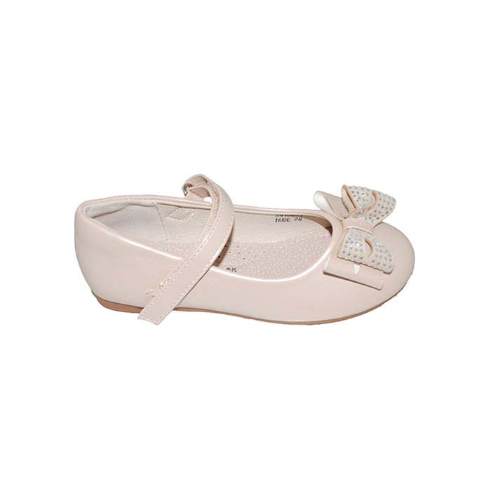 Μπαρέτα δερμάτινη ροζ, δερμάτινος ανατομικός πάτος, αυτοκόλλητο κούμπωμα, σχέδιο με φιογκάκι και στρας, ΜΟΥΓΕΡ