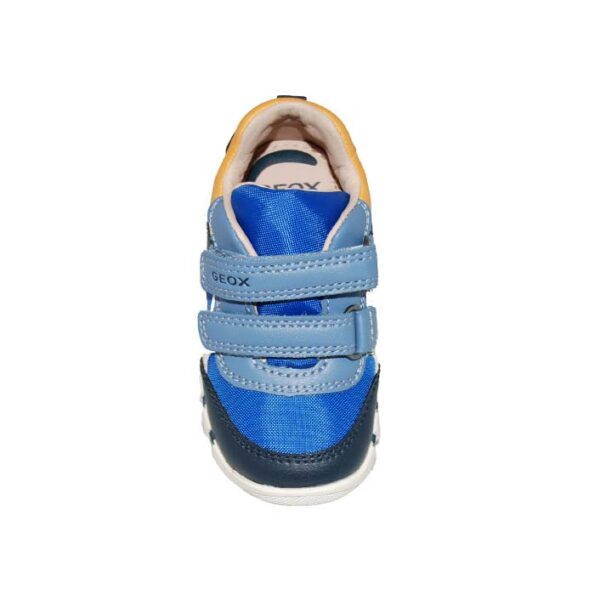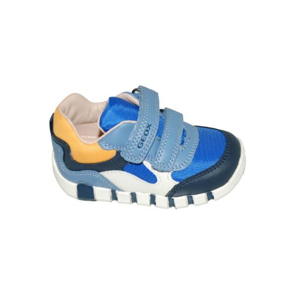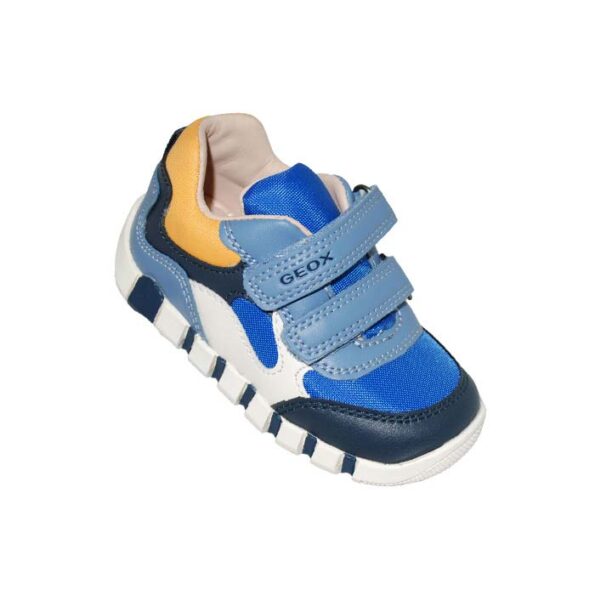 Μποτάκι δερμάτινο πρώτα βήματα μπλε κίτρινο δερμάτινος ανατομικός πάτος, αυτοκόλλητα κουμπώματα, GEOX