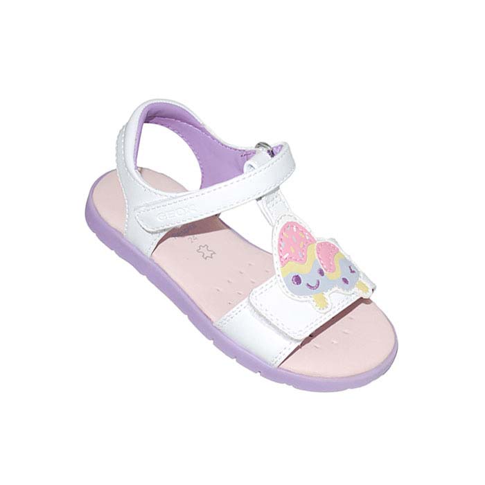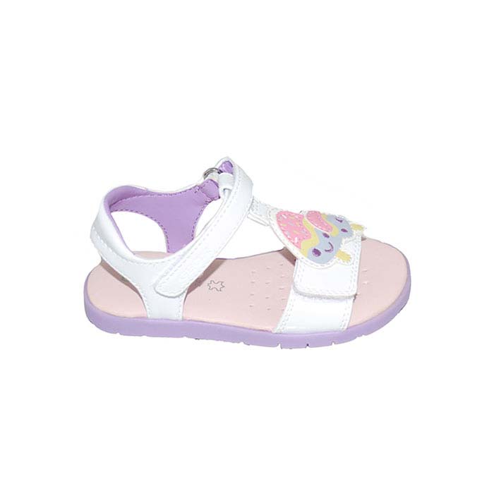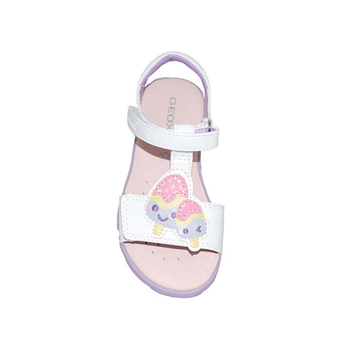 Πέδιλο δερμάτινο λευκό λιλά, δερμάτινος πάτος, αυτοκόλλητα κουμπώματα, σχέδιο με παγωτό, GEOX