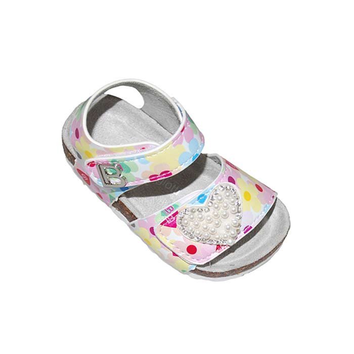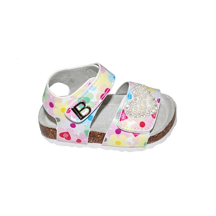 Πέδιλο φελός πολύχρωμος, δερμάτινος ανατομικός πάτος, σόλα τεχνολογίας Respira που επιτρέπει στο πόδι να αναπνέει, αυτοκόλλητο κούμπωμα, σχέδιο με λουλούδια και καρδιά με πέρλες, LAURA BIAGIOTTI