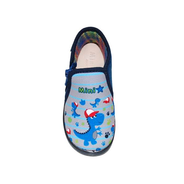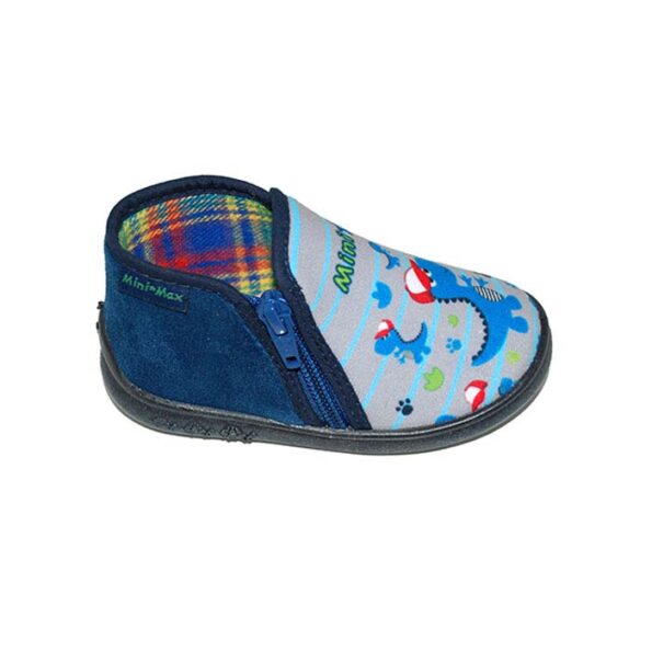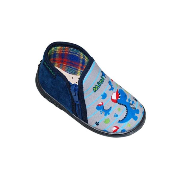 Παντόφλα μπλε γκρι, δερμάτινος ανατομικός πάτος, φερμουάρ στο πλάι, σχέδιο με δεινοσαύρο, MINIMAX
