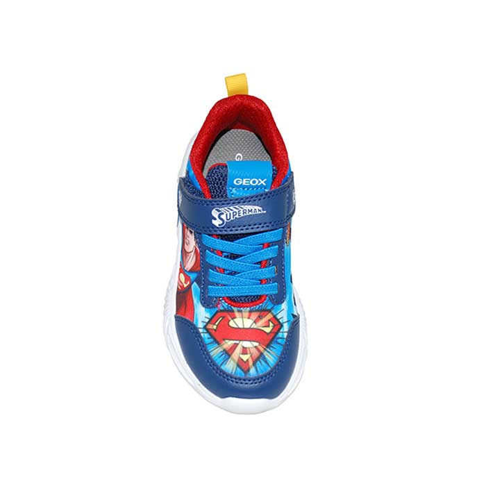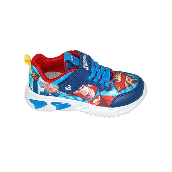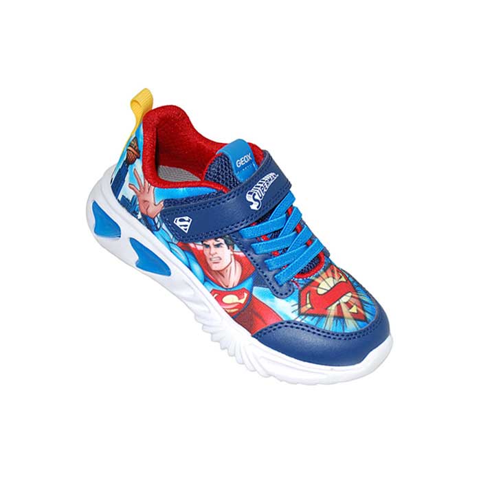 Αθλητικού τύπου μπλε κόκκινο, αυτοκόλλητο κούμπωμα και λάστιχα, κουμπί on/off για τα φωτάκια στην σόλα, σχέδιο Super man, GEOX