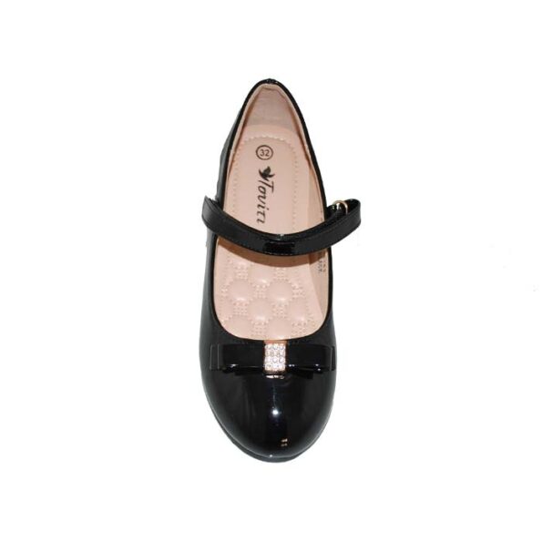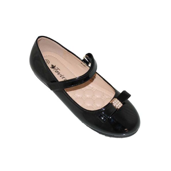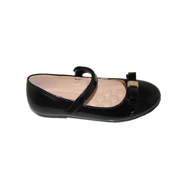 Μπαρέτα λουστρίνι μαύρη, δερμάτινος ανατομικός πάτος, αυτοκόλλητο κούμπωμα, σχέδιο με φιογκάκι και στρας, ΤΟΥΙΤΙ