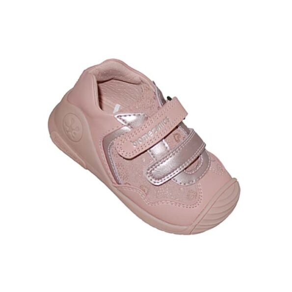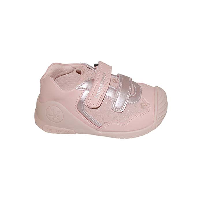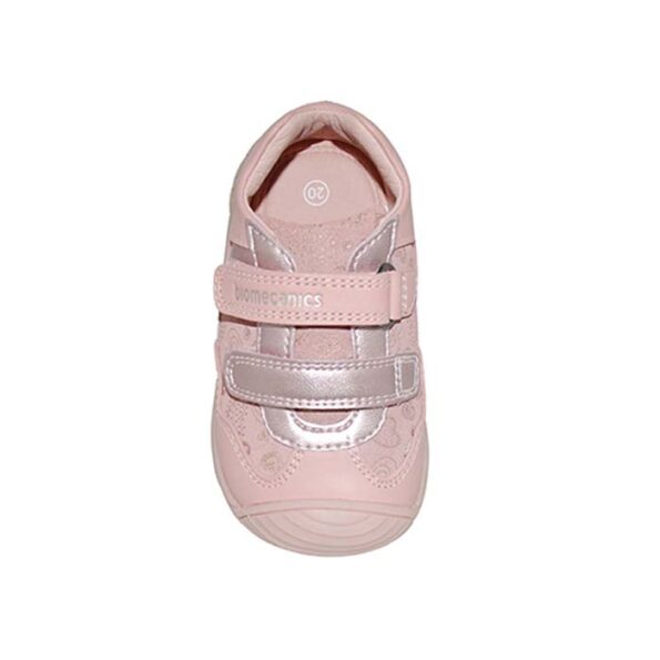 Μποτάκι δερμάτινο πρώτα βήματα ροζ, δερμάτινος ανατομικός πάτος, αυτοκόλλητα κουμπώματα, σχέδιο με καρδούλες, BIOMECANICS