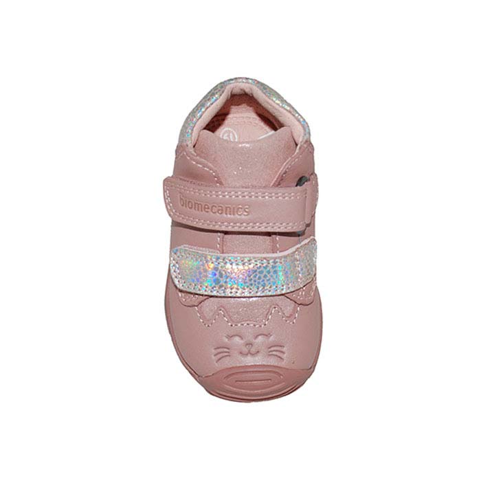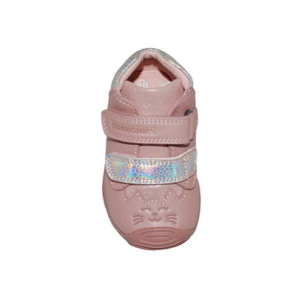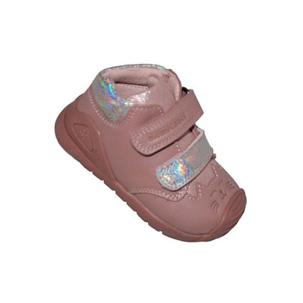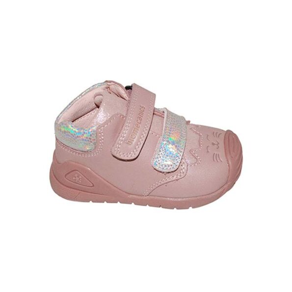 Μποτάκι δερμάτινο σαμουά πρώτα βήματα ροζ, δερμάτινος ανατομικός πάτος, αυτοκόλλητα κουμπώματα, σχέδιο με γατούλα, BIOMECANICS