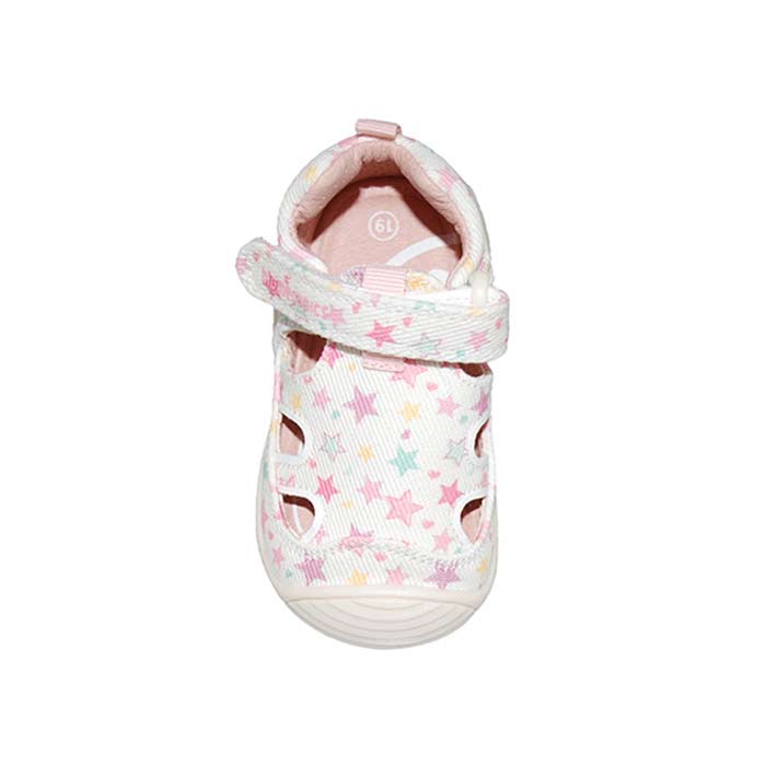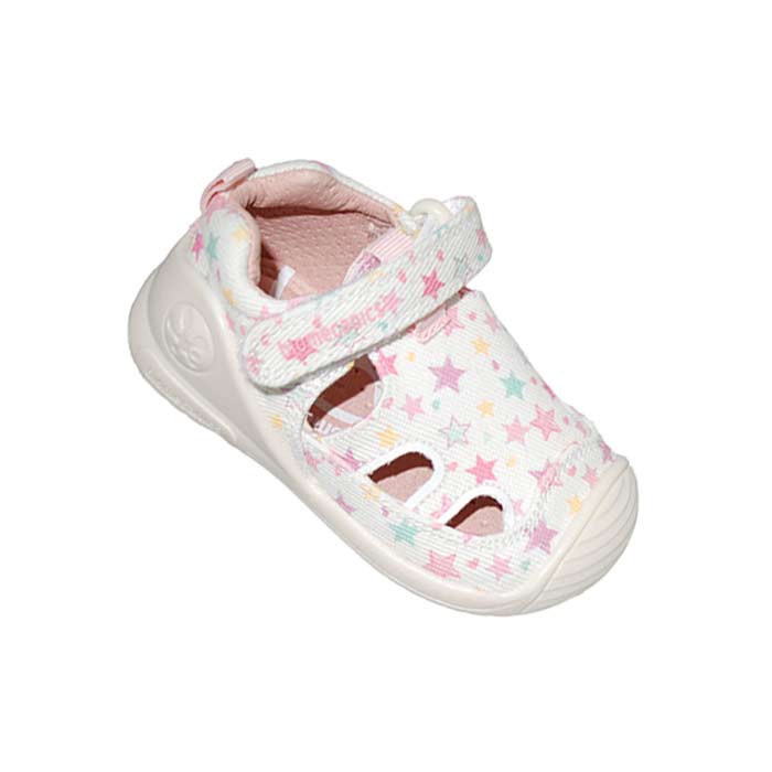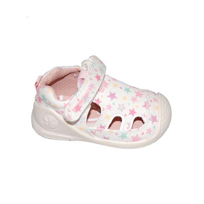 Πάνινο παπουτσοπέδιλο λευκό, δερμάτινος ανατομικός πάτος, αυτοκόλλητο κούμπωμα, σχέδιο με αστέρια, BIOMECANICS