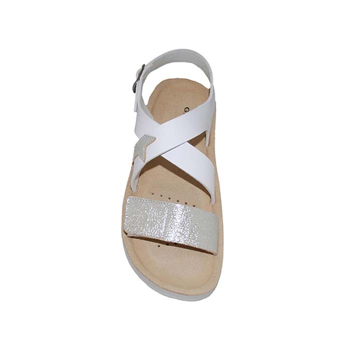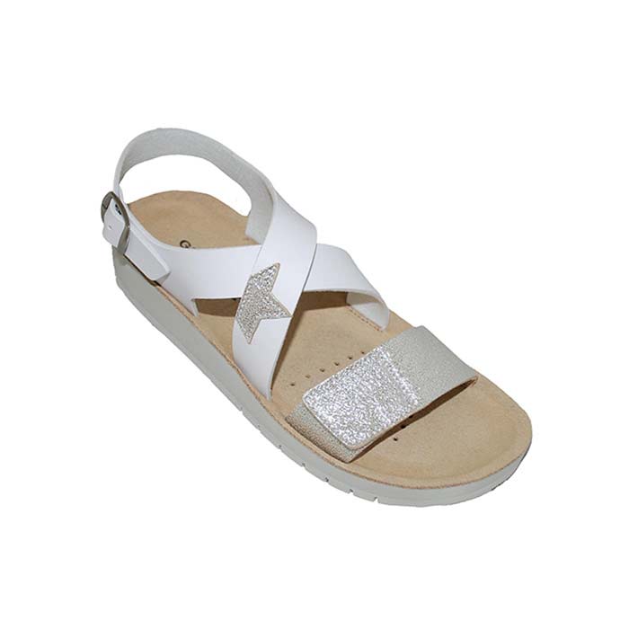 Πέδιλο δερμάτινο λευκό ασημί, δερμάτινος ανατομικός πάτος, αυτοκόλλητο κούμπωμα και τοκά, σχέδιο με αστέρι, GEOX