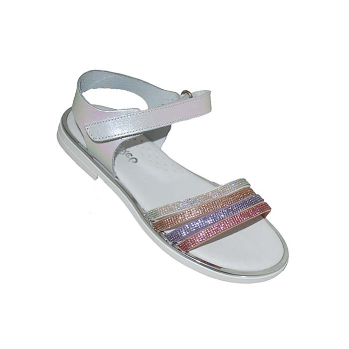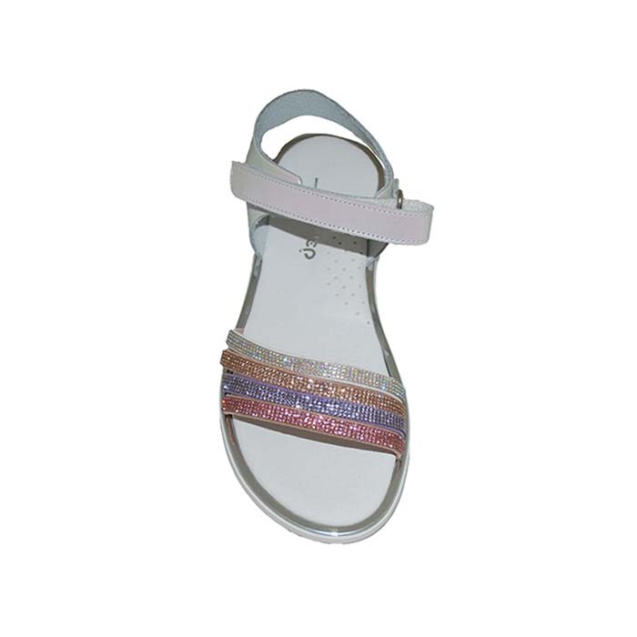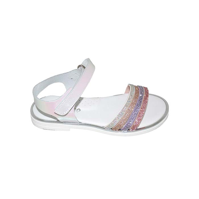 Πέδιλο δερμάτινο λευκό, δερμάτινος ανατομικός πάτος, αυτοκόλλητο κούμπωμα σχέδιο με λουριά και στρας, ΜΟΥΓΕΡ