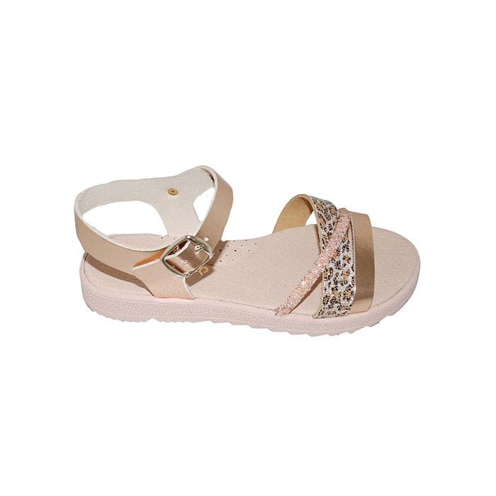 Πέδιλο δερμάτινο χρυσό, δερμάτινος ανατομικός πάτος, κούμπωμα με τοκά, σχέδιο λουριά με στρας, ΜΟΥΓΕΡ