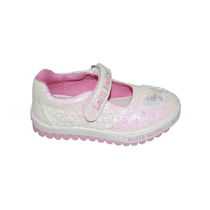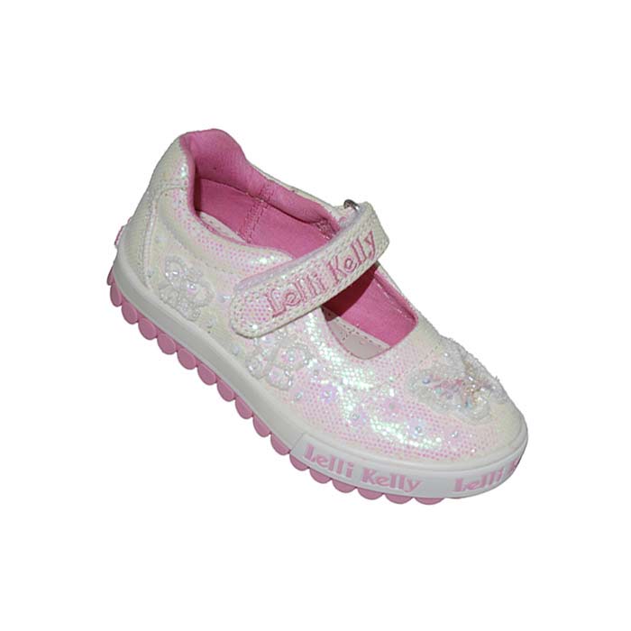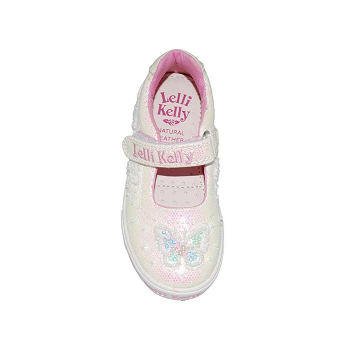 Μπαρέτα λευκή, δερμάτινοσ ανατομικός πάτος, αυτοκόλλητο κούμπωμα, σχεδιο με γκλίτερ, LELLI KELLY