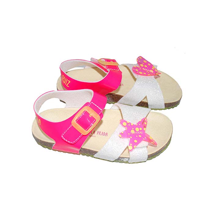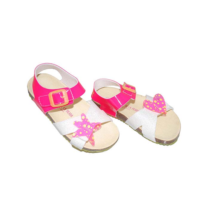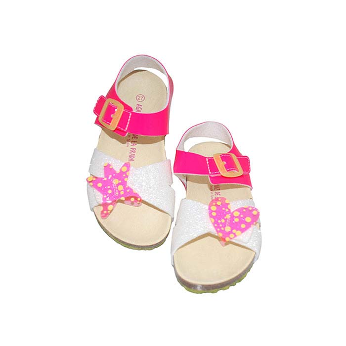 Πέδιλο φελλός λευκό φούξια, δερμάτινος πάτος, αυτοκόλλητα κουμπώματα, σχέδιο με αστέρι και καρδούλα, GARVALIN