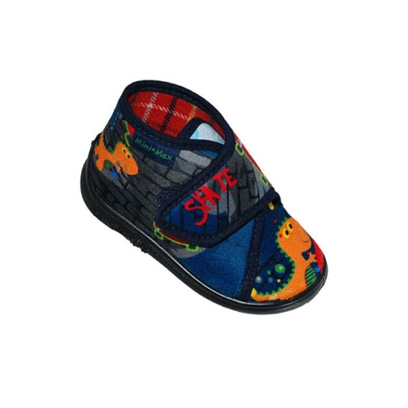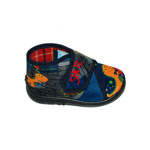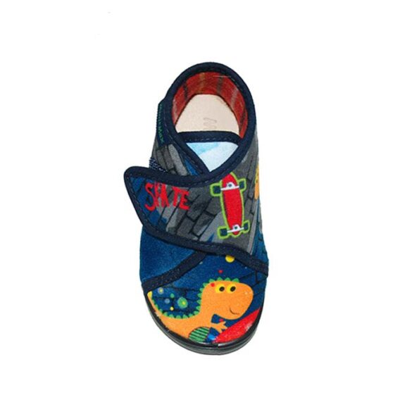 Παντόφλα μπλε, δερμάτινος ανατομικός πάτος, αυτοκόλλητο κούμπωμα, σχέδιο με δεινόσαυρο, MINIMAX