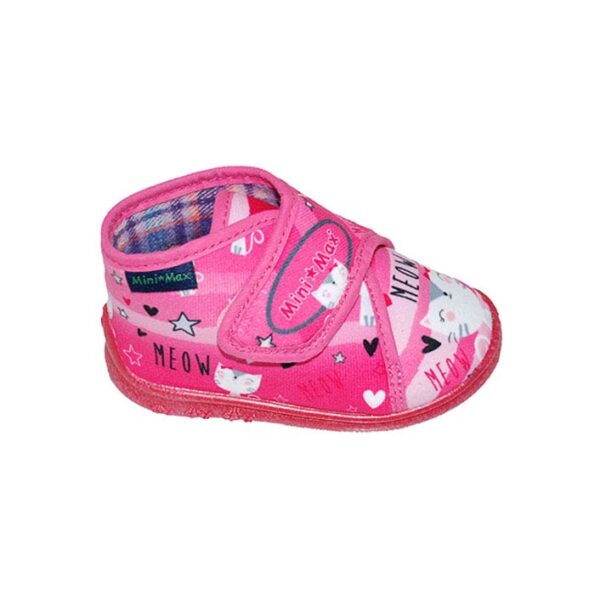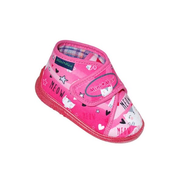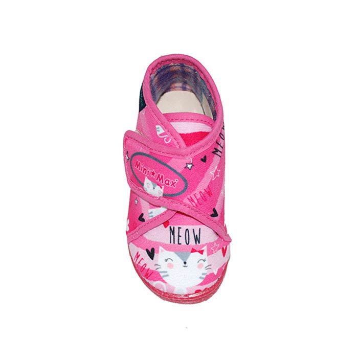 Παντόφλα φούξια ροζ, δερμάτινος ανατομικός πάτος, αυτοκόλλητο κούμπωμα, σχέδιο με γατούλα, MINIMAX