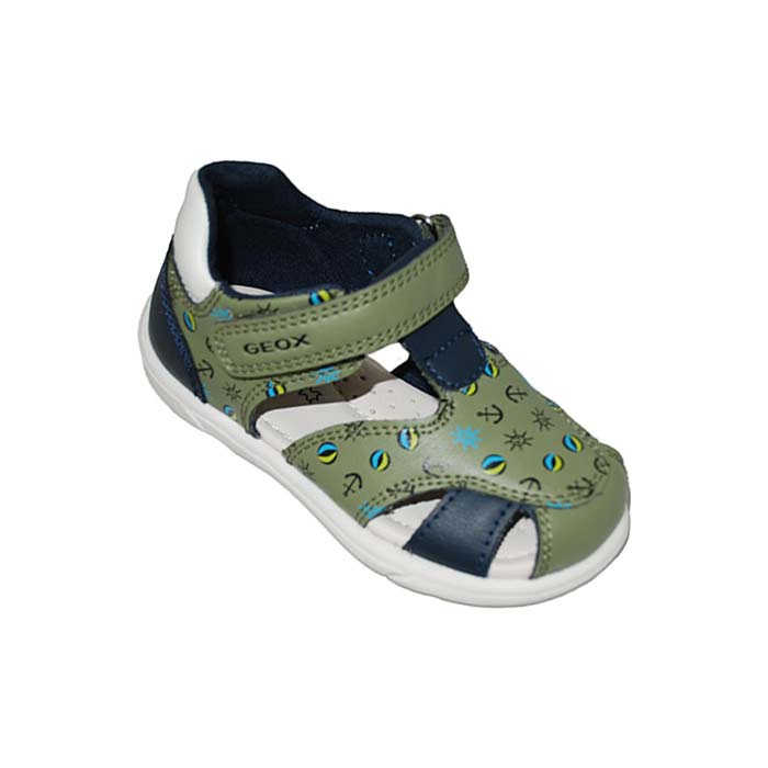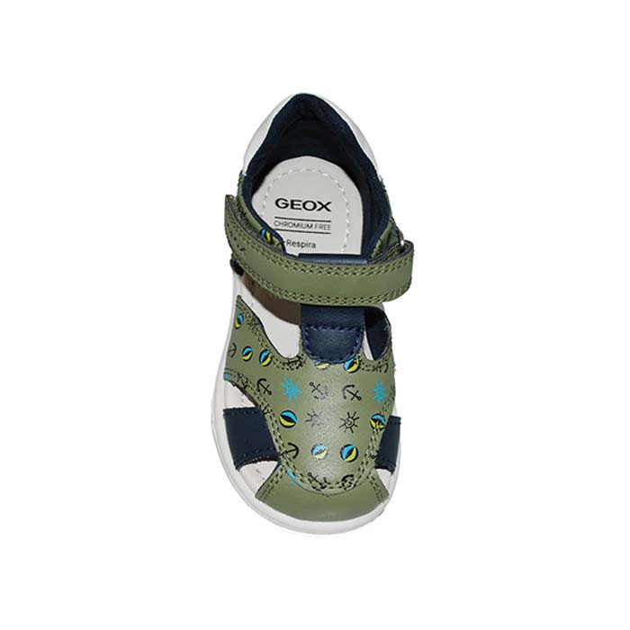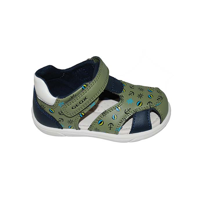 Παπουτσοπέδιλο πρώτα βήματα δερμάτινο χακί, δερμάτινος ανατομικός πάτος, αυτοκόλλητο κούμπωμα, σχέδιο με άγκυρες, GEOX