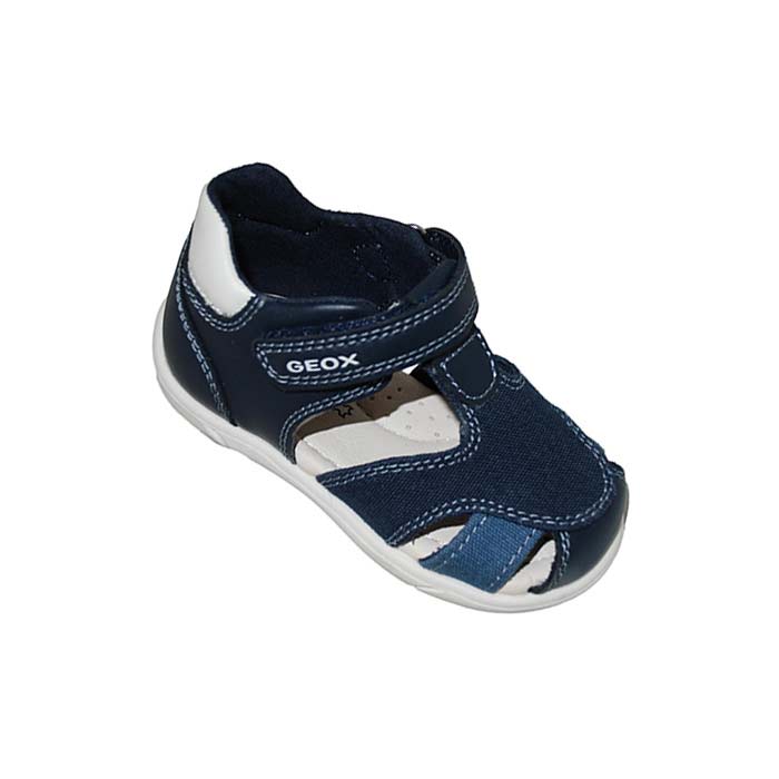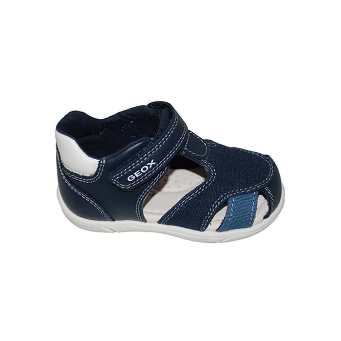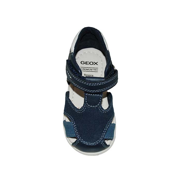 Παπουτσοπέδιλο πρώτα βήματα δερμάτινο και ύφασμα μπλε λευκό, δερμάτινος ανατομικός πάτος, αυτοκόλλητο κούμπωμα, GEOX