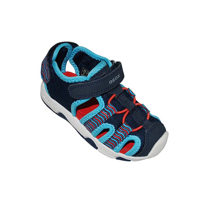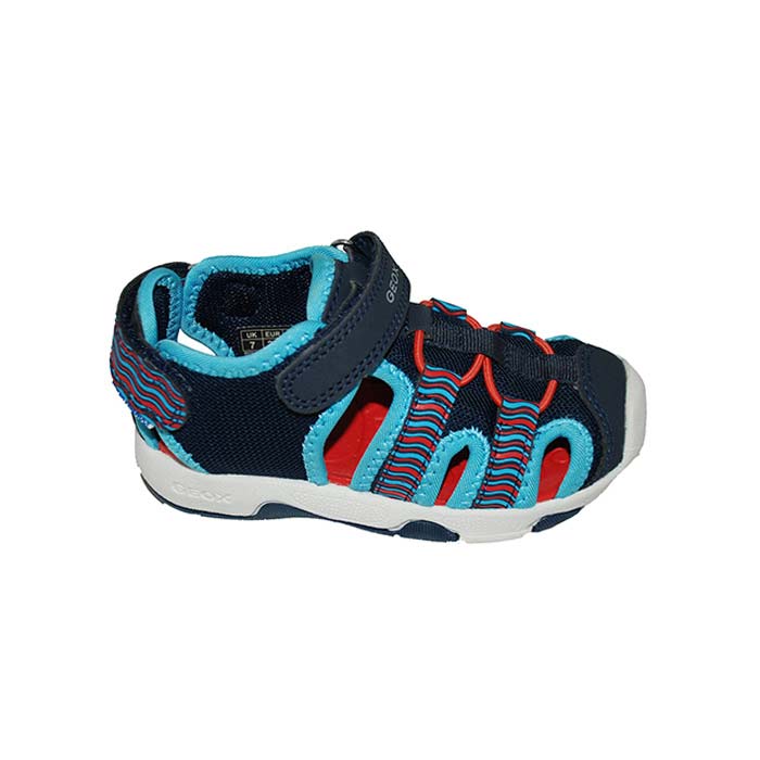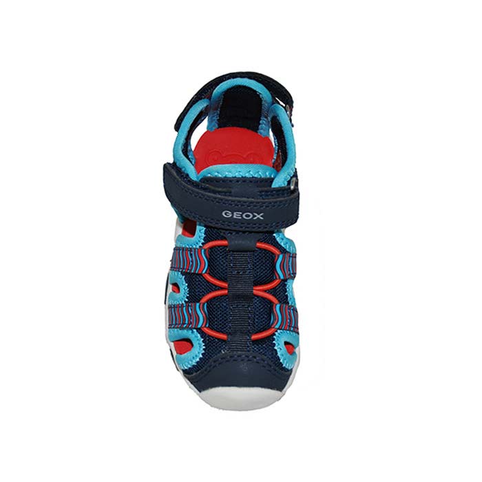 Παπουτσοπέδιλο πρώτα βήματα δερμάτινο και ύφασμα μπλε γαλάζιο, αυτοκόλλητο κούμπωμα, σχέδιο με λάστιχα, GEOX