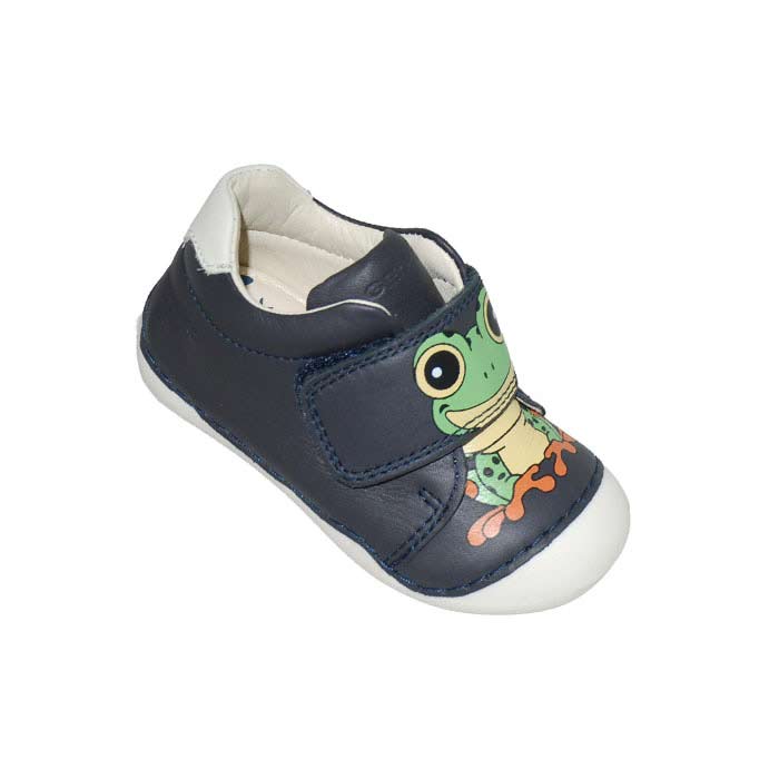 Παπουτσοπέδιλο πρώτα βήματα δερμάτινο μπλε, δερμάτινος ανατομικός πάτος, αυτοκόλλητο κούμπωμα, σχέδιο με βάτραχο, GEOX