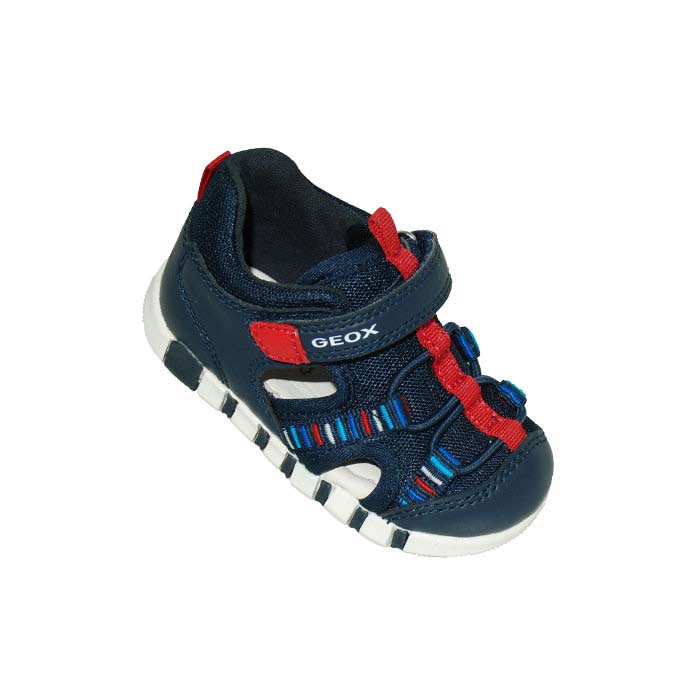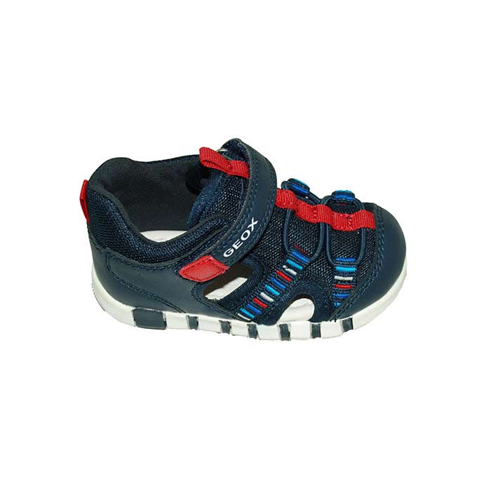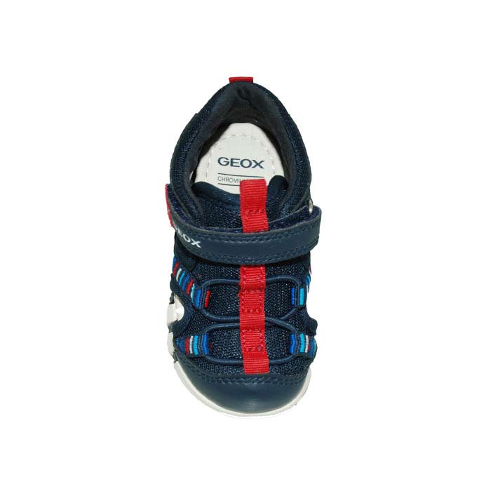 Παπουτσοπέδιλο πρώτα βήματα δερμάτινο και ύφασμα μπλε, δερμάτινος ανατομικός πάτος, αυτοκόλλητο κούμπωμα, σχέδιο με λάστιχα, GEOX