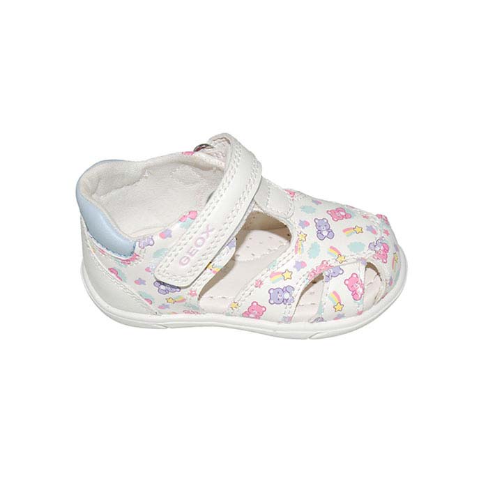 Παπουτσοπέδιλο πρώτα βήματα δερμάτινο λευκό σιέλ, δερμάτινος ανατομικός πάτος, αυτοκόλλητο κούμπωμα, σχέδιο με λουριά και αρκουδάκια, GEOX