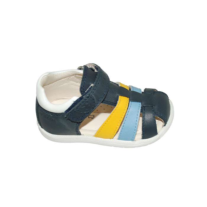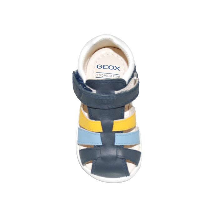 Παπουτσοπέδιλο πρώτα βήματα δερμάτινο μπλε κίτρινο, δερμάτινος ανατομικός πάτος, αυτοκόλλητο κούμπωμα, GEOX