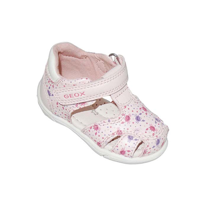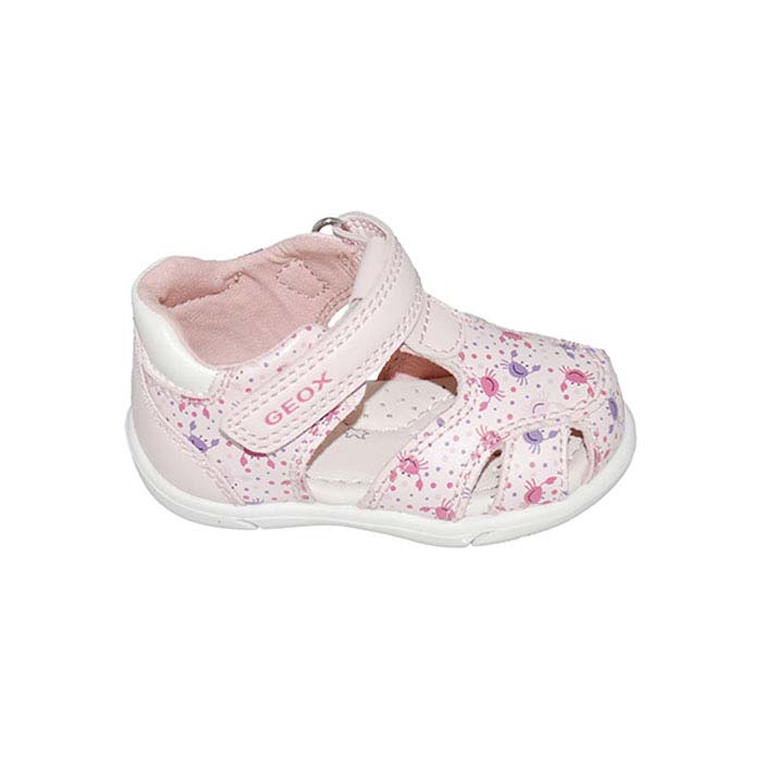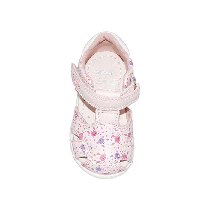 Παπουτσοπέδιλο πρώτα βήματα δερμάτινο ροζ λευκό, δερμάτινος ανατομικός πάτος, αυτοκόλλητο κούμπωμα, σχέδιο με λουριά και καβουράκια, GEOX